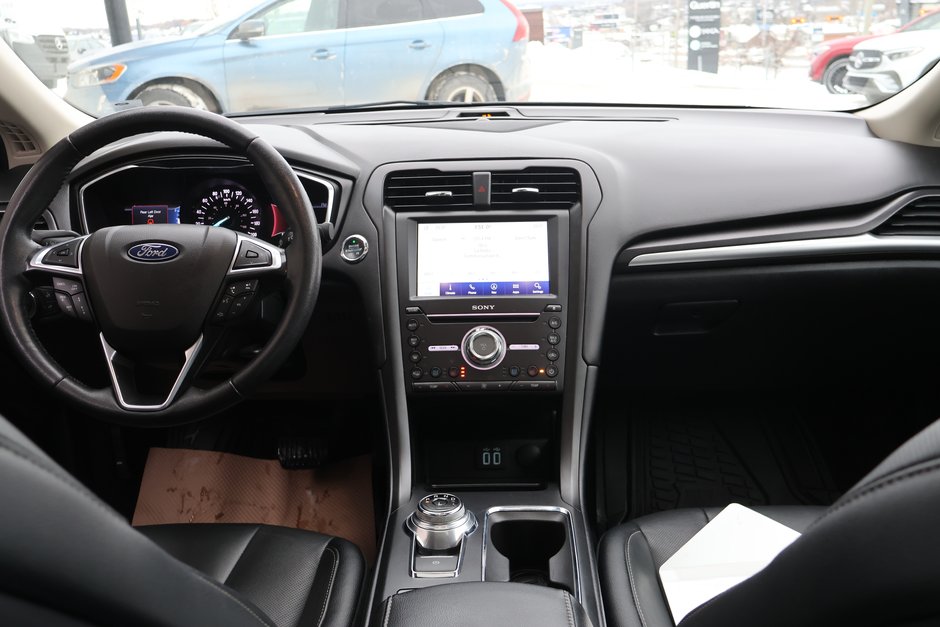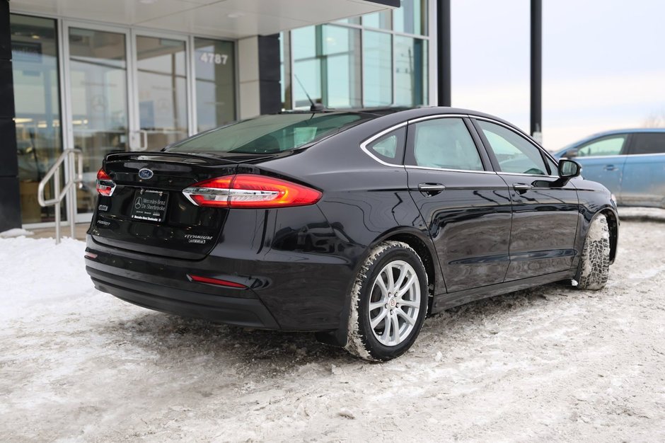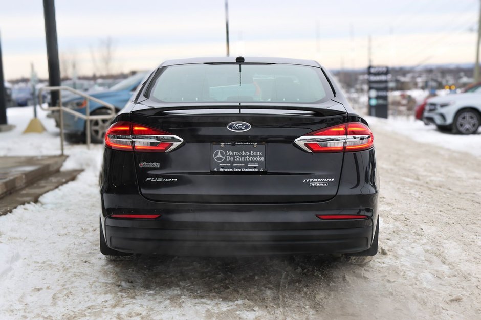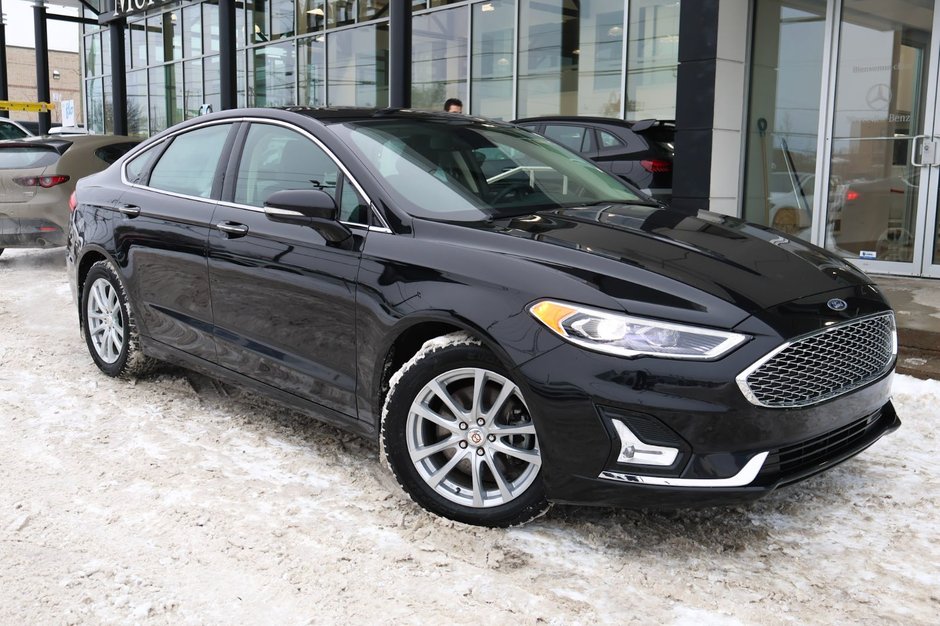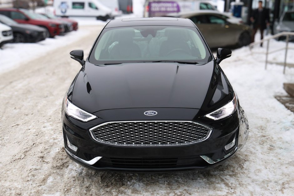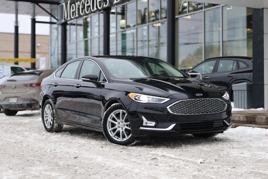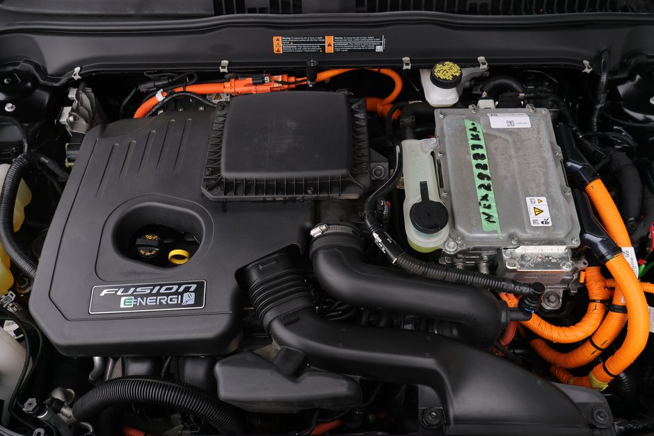 The 2020 Ford Fusion Titanium Energi is a top-trim plug-in hybrid (PHEV) sedan featuring a 2.0L Atkinson-cycle engine and a 9 kWh battery, producing a combined 188 horsepower. It offers roughly 25-35 km of electric range and a 43/41 city/hwy MPG rating. The Titanium model includes premium features like leather-trimmed heated/ventilated seats, a 12-speaker Sony audio system, and navigation.